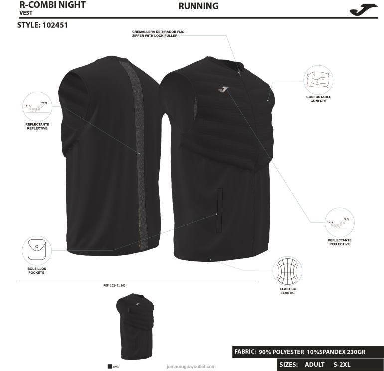 Chaleco acolchado con bolsillos con cremallera. Incorpora el logo y una banda trasera de tejido reflectante para aumentar la visibilidad del deportista. incluye tejido transpirable en el interior.